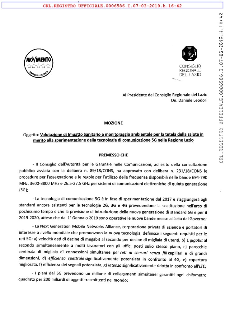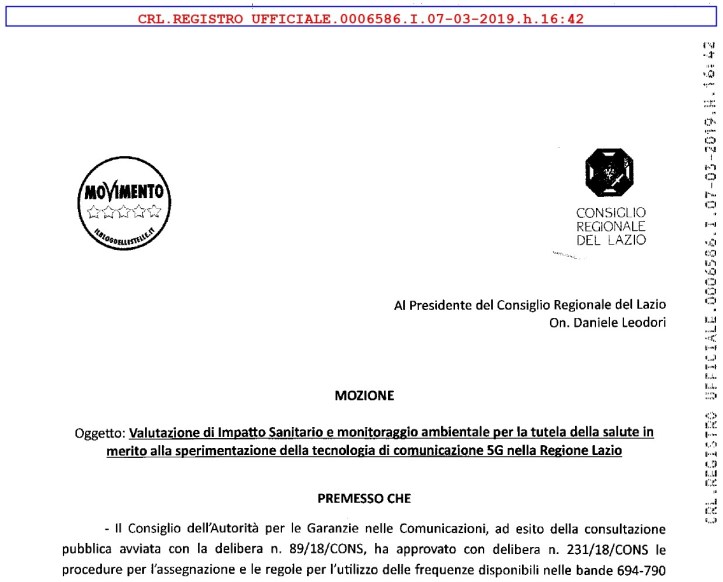 Il timbro informatico è dell’ufficio protocollo del Consiglio della Regione Lazio: nei prossimi giorni a Via della Pisana si discuterà di 5G, o meglio di come fermare lo tsunami elettromagnetico per salvaguardare la salute pubblica, minacciata dalle inesplorate radiofrequenze dell’Internet delle cose. Come già accaduto in Regione Piemonte, anche in Regione Lazio arriva una mozione STOP 5G, la seconda nelle regioni italiane, presentata ancora una volta – a Torino come a Roma – da consiglieri del MoVimento 5 Stelle.