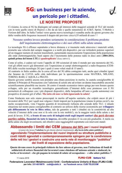 Confederazione Unitaria di Base Telecom (CUB), il più importante sindacato di base operante nel nostro paese, fa la voce grossa all’interno del colosso di telefonia mobile, insieme alla Federazione Lavoratori Metalmeccanici Uniti: hanno diffuso un allarmante comunicato stampa sul lato oscuro del 5G, denunciando il pericolo socio-sanitario del wireless di quinta generazione nel grande business delle aziende, propense – a detta dei lavoratori – unicamente al profitto privato e non alla tutela della salute pubblica. OASI SANA riporta per intero la nota dei lavoratori.