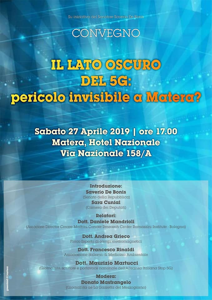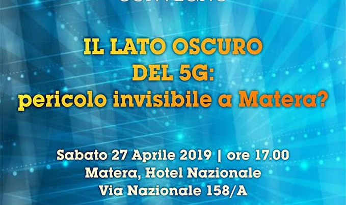Dopo gli incontri sui pericoli dell’elettrosmog a Lecce, la campagna di prevenzione sui pericoli di Wi-Fi e telefoni cellulari nelle scuole di Bari, la mobilitazione contro l’inquinamento invisibile a Barletta e il primo corteo Stop 5G sfilato nelle vie di Bagheria (Palermo), adesso tocca al primo convegno Stop 5G del Sud d’Italia.E’ in programma Sabato 27 Aprile 2019 alle ore 17.00 presso l’Hotel Nazionale di Matera (Via Nazionale 158/A) si terrà l’incontro “Il lato oscuro del 5G, il pericolo invisibile a Matera?”, si tratta di un incontro promosso dal Sen. Saverio De Bonis dopo la conferenza stampa dell’alleanza italiana Stop 5G tenuta nei giorni scorsi in Senato con le testimonianze degli ammalati di elettrosensibilità e di tumore al cervello a cui i tribunali italiani hanno già riconosciuto il nesso tra l’elettrosmog e cancro. Non è un caso che l’evento sui pericoli del 5G si terrà in terra lucana, essendo il wireless di quinta generazione già in fase sperimentale nella Smart City Matera nonostante le preoccupazioni di associazioni/comitati lucani rivolte al Sindaco della capitale europea della cultura 2019.