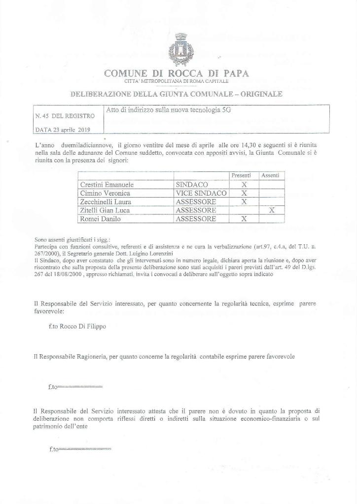 Riunta nella sala delle adunanze del Comune di Rocca di Papa, il Sindaco Emanuele Cristini e la sua Giunta Comunale (oltre Cimino, presenti gli assessori Laura Zecchinelli e Danilo Romei, assente solo Gian Luca Zitelli) nell’ordine del giorno n° 45 il 23 Aprile 2019 hanno deliberato un “atto di indirizzo sulla tecnologia 5G”, cioè una moratoria per scongiurare l’adozione della fase sperimentale del temuto wireless di quinta generazione. Un atto di indirizzo di governo locale determinato e forte che altri comuni italiani, nei prossimi giorni, si apprestano a replicare nell’interesse esclusivo di salvaguardia della salute pubblica.