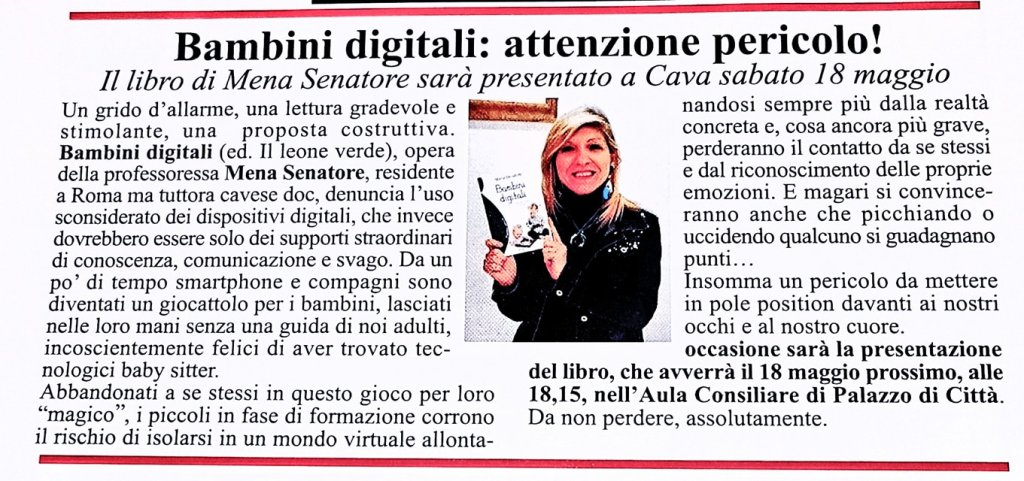 “Bambini digitali. L’alterazione del pensiero creativo e il declino dell’empatia” (Edizioni Il leone verde) è il riuscitissimo libro di Mena Senatore, campana di Cava dè Tirreni trapiantata a Roma che, al suo bagaglio esperienziale maturato nell’insegnamento ai giovani, è riuscita ad unire l’apprensione saggia di madre con la voglia d’investigare su effetti collaterali, distorsioni metodologiche e disturbi cognitivi che l’adultizzazione dei bambini sta causando sulla cosiddetta generazione dei nativi digitali, entusiasticamente incensata come la più perfetta nella storia dell’umanità, ignorando la fagocitazione di gradualità, lentezza, competenze cognitive e vita reale perpetrata da un subdolo sistema consumistico che ha trasformato la realtà virtuale in un mondo nient’affatto a misura di bambino. Anzi. Perché dare uno Smartphone in mano ad un minore è come lasciarlo solo, metterlo fuori casa per una notte. Tra insidie e incognite che possono sfociare in seri disturbi della personalità. Dove stanno traghettando i nostri figli?