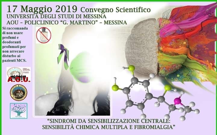 Messina, venerdì 17 Maggio 2019 nell’Aula A PalaCongressi del Policlinico si tiene il convegno scientifico “SINDROMI DA SENSIBILIZZAZIONE CENTRALE: SENSIBILITÀ CHIMICA MULTIPLA E FIBROMIALGIA” Responsabile Scientifico dell’evento è la Prof.ssa Daniela Caccamo ( UniME), l’incontro è organizzato in collaborazione col Comitato Fibromialgici Uniti (CFU-Italia), associazione di volontariato no-profit che riunisce pazienti che soffrono di Encefalite Mialgica Benigna, Fibromialgia e Sensibilità Chimica Multipla, e sollecitato dal Vice Presidente Esecutivo Serafina Cracchiolo in occasione del suo insediamento alla recente apertura dei lavori del tavolo tecnico dell’Assessorato alla Salute-Regione Sicilia su queste patologie.