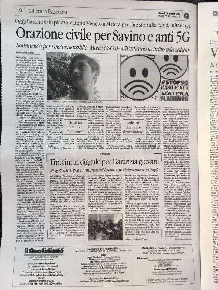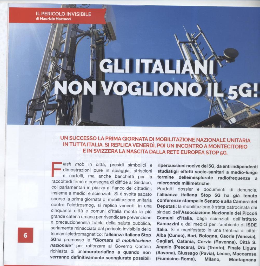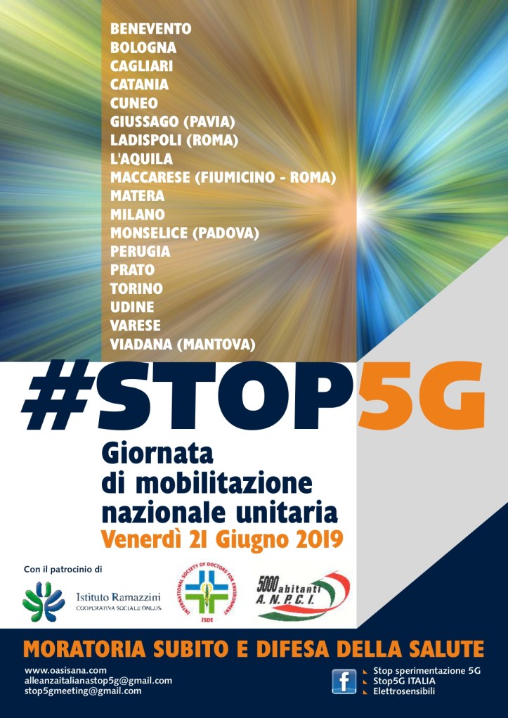 Ne riporta notizia la stampa, servizi anche nelle Tv locali, e lancio dell’agenzia ANSA. La seconda giornata nazionale di mobilitazione nazionale promossa dall’alleanza italiana Stop 5G è stato un successo, ancora una volta tanta spontanea partecipazione e informazione dal basso con l’appoggio di medici, scienziati, sindaci e parlamentari. Il popolo per la precazione s’è mobilitato ieri in tutta Italia: per la seconda volta, in simultanea ancora flash mob, convegni, azioni informative, raccolte firme, manifestazioni pubbliche. Questi i piccoli centri e le città coinvolte, superata quota 50 in soli sei giorni: BENEVENTO, BOLOGNA, CAGLIARI, CATANIA, CESENA, CUNEO, GIUSSAGO (PAVIA), LADISPOLI (ROMA), L’AQUILA, FIUMICINO (ROMA), MATERA, MILANO, MONSELICE (PADOVA), PERUGIA (22/6),RIMINI,TORINO, UDINE, VARESE, VERBANIA, VIADANA (MANTOVA).