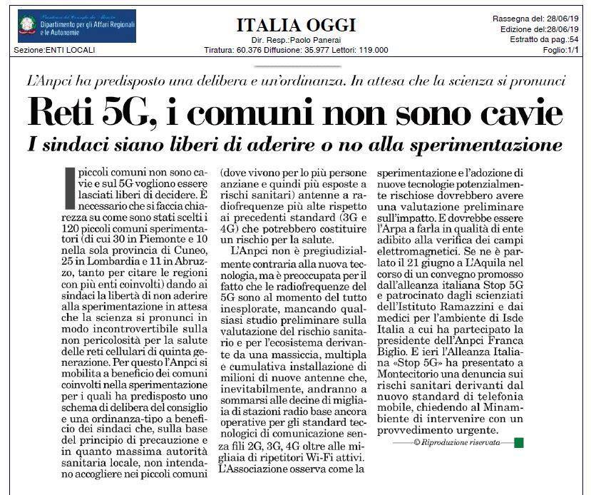 E’ proprio per questo che molti sindaci non ci stanno. E non vogliono il 5G. E dai piccoli e grandi centri parte la tecnoribellione! Se una sessantina di amministrazioni è già indirizzata per la linea della precauzione, 14 Comuni hanno infatti approvato delibere di giunta Stop 5G o mozioni di consiglio comunale Stop 5G, così come la moratoria sul territorio viene invocata anche da Franca Biglio, sindaco cuneese di Marsaglia artefice della prima ordinanza italiana urgente e contingibile contraria all’avanzata del 5G, nonché battagliero presidente dell’Associazione Nazionale dei Piccoli Comuni d’Italia (ANPCI): sulle colonne economiche di ‘Italia Oggi’, l’ANPCI (all’opposto dell’ANCI allineata al 5G) afferma infatti che ‘i Comuni non sono cavie, in attesa che la scienza si pronunci i sindaci sono liberi di aderire o no alla sperimentazione’, libertà di scelta e moratoria rivendicate pure su la ‘Gazzetta del Tevere’ da Silverio De Bonis (Sindaco di Filacciano, Roma), rappresentante della delegazione dei primi cittadini del Lazio.