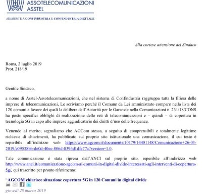 Seconda mossa. Tre giorni fa, il 2 Luglio, ancora Asstel profila il target e indirizza una lettera bonaria ai 120 sindaci dei piccoli Comuni d’Italia individuati dall’AgCom nella famigerata delibera del 2018 in cui si sono stabilite “le procedure per l’assegnazione e le regole per l’utilizzo delle frequenze disponibili nelle bande 694-790 MHz, 3600-3800 MHz e 26.5-27.5 GHz per sistemi terrestri di comunicazioni elettroniche al fine di favorire la transizione verso la tecnologia 5G”.
