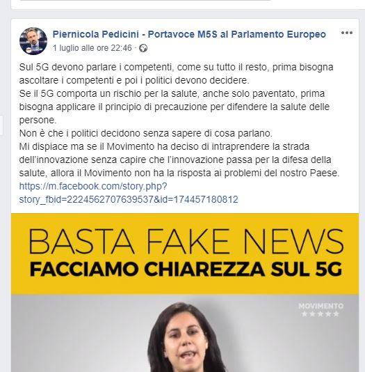 Un appello che ha trovato sponda pure tra gli scranni di Bruxelles, dove Pierluigi Pedicini (europarlamentare M5S laureato in Fisica Teorica con specializzazione in Fisica Medica) commentando il video pro-5G della Liuzzi afferma su Facebook che “sul 5G devono parlare i competenti, come su tutto il resto, prima bisogna ascoltare i competenti e poi i politici devono decidere. Se il 5G comporta un rischio per la salute, anche solo paventato, prima bisogna applicare il principio di precauzione per difendere la salute delle persone. Non è che i politici decidono senza sapere di cosa parlano. Mi dispiace ma se il Movimento ha deciso di intraprendere la strada dell’innovazione senza capire che l’innovazione passa per la difesa della salute, allora il Movimento non ha la risposta ai problemi del nostro Paese”.