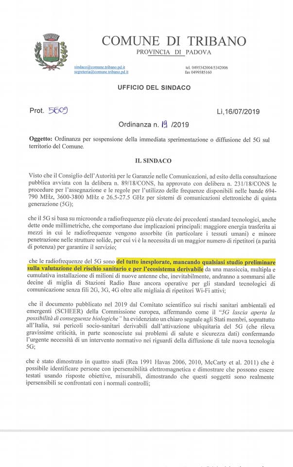 “Ordina la sospensione della immediata sperimentazione o diffusione del 5G sul territorio del Comune in attesa della nuova classificazione della cancerogenesi annunciata dall’International Agency for Resarch on Cancer, applicando il principio precauzionale sancito dall’Unione Europea”. Spedita a mezzo PEC al Presidente della Repubblica, ai ministri del Governo, all’AgCom e alle compagnie telefoniche, l’ultima ordinanza sindacale urgente e contingibile emessa da un Sindaco italiano è del 16 Luglio 2019 e porta la firma di Massimo Carazzana, primo cittadino del Comune di Tribano (Padova).