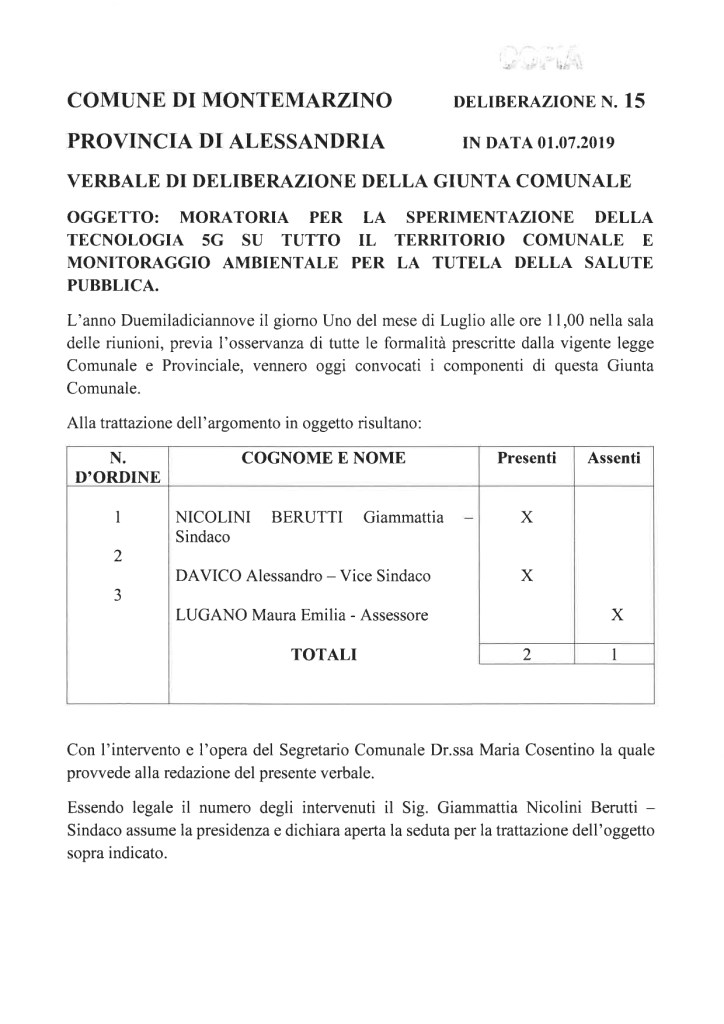 Scrive sulla pagina Facebook istituzionale il Comune di Avolasca (Alessandria), nel novero dei precauzionisti: “la Giunta Comunale si è riunita il 12 Giugno 2019 deliberando che IL COMUNE ESPRIME PARERE NEGATIVO RIGUARDO L’ESTENSIONE SUL TERRITORIO COMUNALE DELLA NUOVA TECNOLOGIA 5G, ADERENDO ALLA RICHIESTA DI MORATORIA, PROMUOVENDO ALLO STESSO TEMPO SOLUZIONI TECNOLOGICHE SICURE E A BASSO IMPATTO AMBIENTALE”.