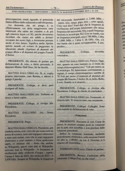 Vari studi hanno dimostrato i danni alla salute che può causare il 5G, e lo stesso Governo aveva dato un parere favorevole agli impegni da noi richiesti nella mozione, ma d’un tratto,in aula, parte della maggioranza incredula del parere positivo appena espresso, ha deciso di far pressione con modi alquanto minacciosi, sul sottosegretario, fino a portarla a ritirare il parere espresso poco prima, e rimettendosi al voto dell’aula!