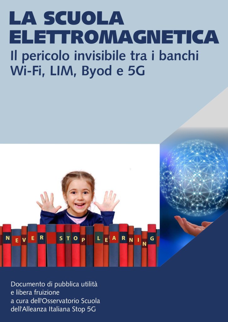 Per contribuire a smascherare l’imperversante deriva tecnocratica dell’ipertecnolgizzazione di massa e del wireless ubiquitario nelle sue ricadute socio-culturali-sanitarie, l’Alleanza Italiana Stop 5G ha così al proprio interno costituito l’Osservatorio Scuola, un gruppo di volontari composto in prevalenza da personale docente, impegnato nella tutela della salute e dell’integrità pisco-fisica dei vari attori coinvolti nella sperimentazione della cosiddetta scuola digitale. Ne è nato “LA SCUOLA ELETTROMAGNETICA. Il pericolo invisibile tra i banchi. Wi-Fi, LIM, Byod e 5G”, un dossier di analisi politica, denuncia e proposte virtuose, messo dal basso liberamente in condivisione per sensibilizzare opinione pubblica, attori politico-istituzionali-decisionali e comparto scolastico su quella che in molti non esitano più a definire come vera e propria emergenza sociale e sanitaria.