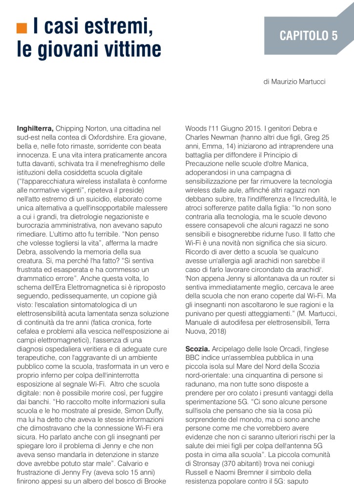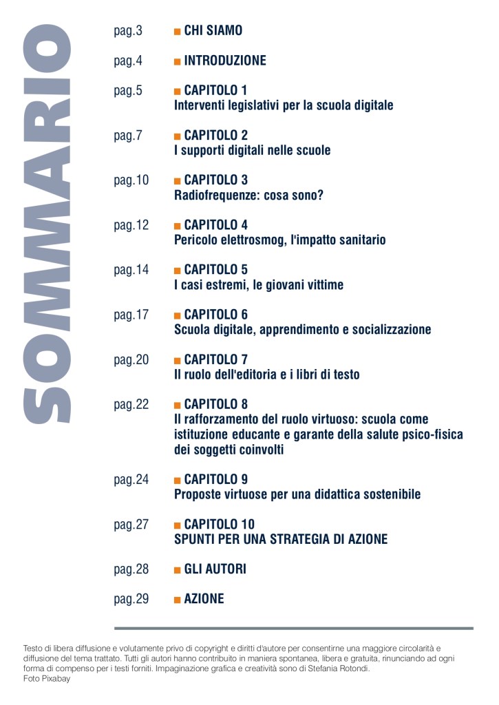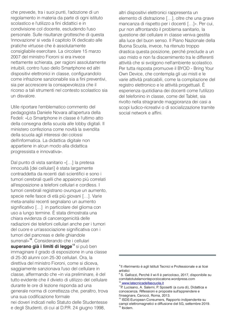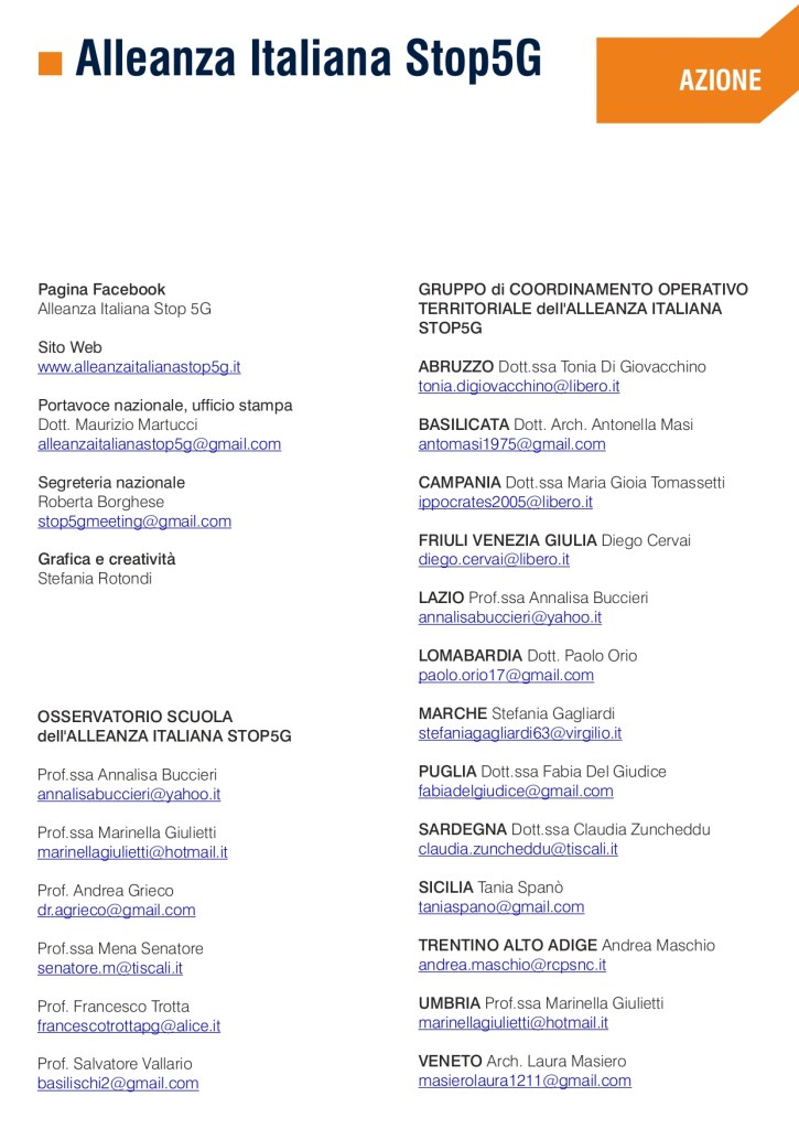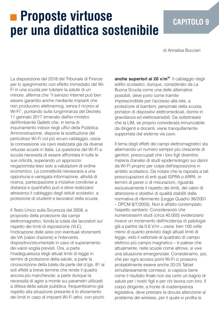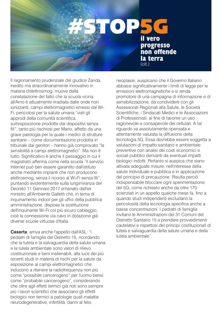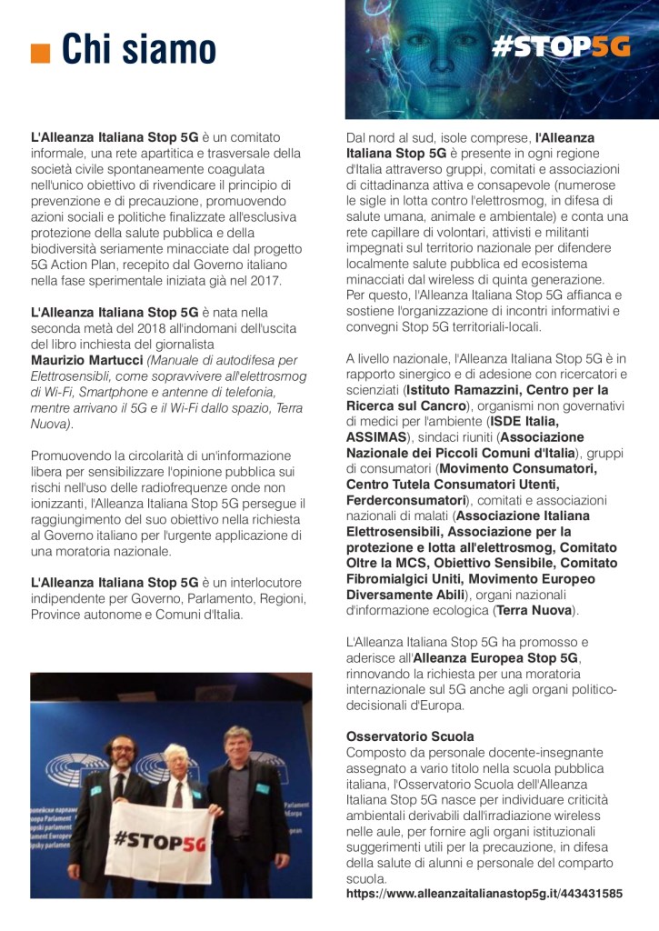 “Uno strumento di consapevolezza, di verità e di denuncia, da far circolare nelle scuole per accrescere il grado di coscienza sui gravi rischi invisibili”. Durante i lavori del convegno internazionale “Moratoria nazionale, 5G tra rischi per la salute e principio di precauzione” alla Camera dei Deputati , l’Osservatorio Scuola dell’Alleanza Italiana Stop 5G ha presentato “LA SCUOLA ELETTROMAGNETICA. Il pericolo invisibile tra i banchi, Wi-Fi, LIM, Byod e 5G“, un dossier di denuncia su insidie e pericoli della cosiddetta scuola digitale. Si tratta di un documento di 30 pagine, pensato per MIUR, dirigenti scolastici, insegnanti, alunni e loro famiglie, redatto col contributo di personale docente esperto di problematiche legate alla digitalizzazione dell’insegnamento nei pericolosi risvolti per la salute.