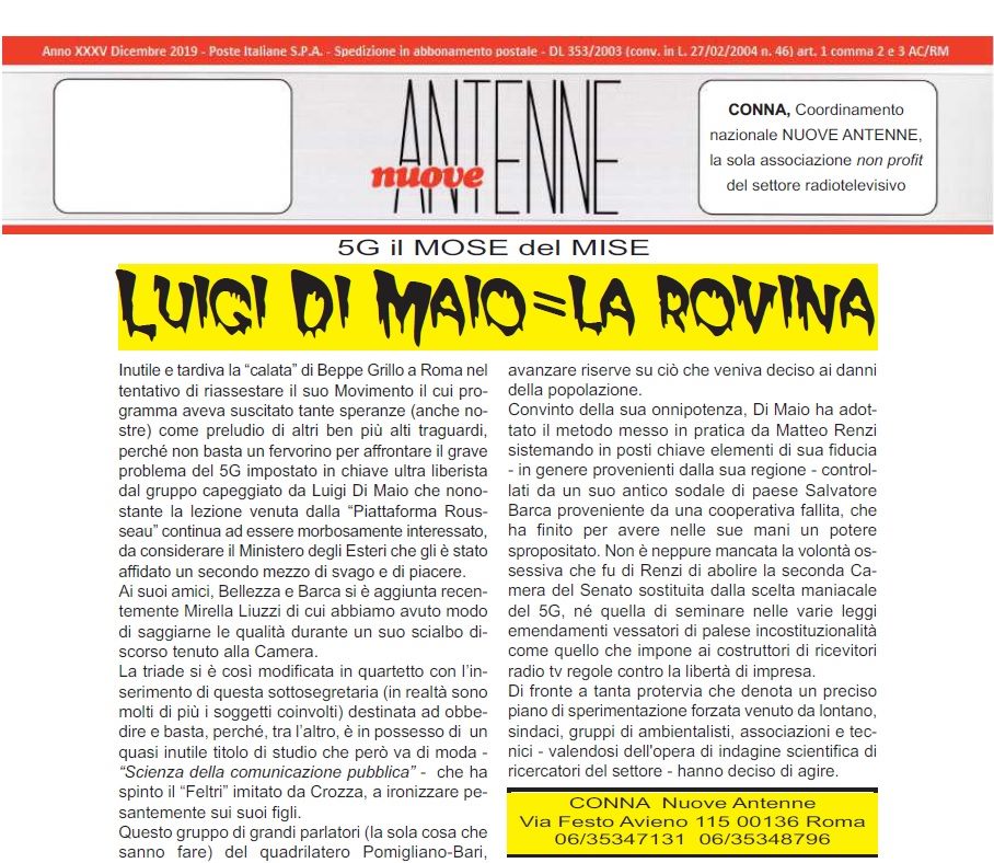 Nato nel 1975, il CONNA è un coordinamento nazionale no profit di tecnici. E’ stato anche audito alla Camera dei Deputati in Commissione Trasporti, Poste e Telecomunicazioni. Oltre ad aver scritto un’istanza ai Sindaci, attraverso Nuove Antenne – il suo bollettino cartaceo – ha invitato i parlamentari a prendere consapevolezza sui rischi del 5G. Nell’ultimo numero, il CONNA ha paragonato il 5G al Mose del Mise.