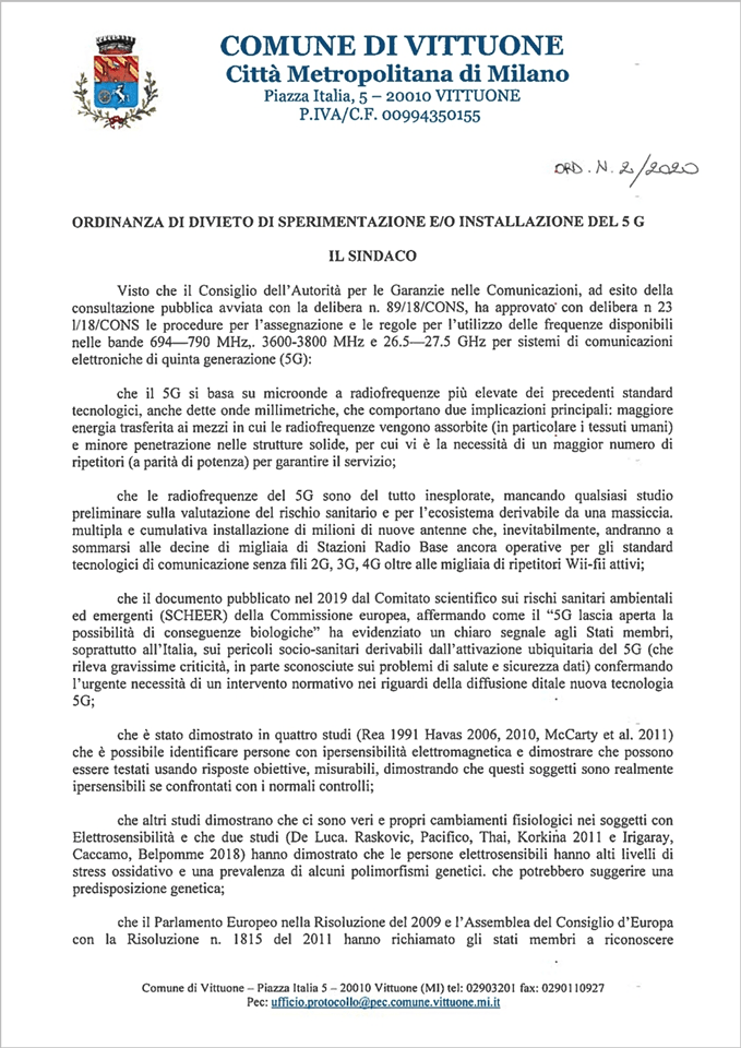 A Milano il comitato No 5G da appuntamento ai cittadini in Piazza della Scala (ore 14-16,30), mentre il Sindaco di Binasco approfitta della manifestazione per dichiararsi contrario all’invasione d’antenne e la cittadinanza lo invita a stare al fianco di chi lotta per difendere umanità e ambiente. Intanto a Vittuone (area Metropolitana di Milano) il Sindaco Arch. Stefano Zancanaro ha emanato un’ordinanza urgente e contingibile Stop 5G, portando a 133 il numero dei Comuni d’Italia ufficialmente per la precauzione e a 29 il computo dei primi cittadini che hanno emanato ordinanze per la moratoria sul territorio.
