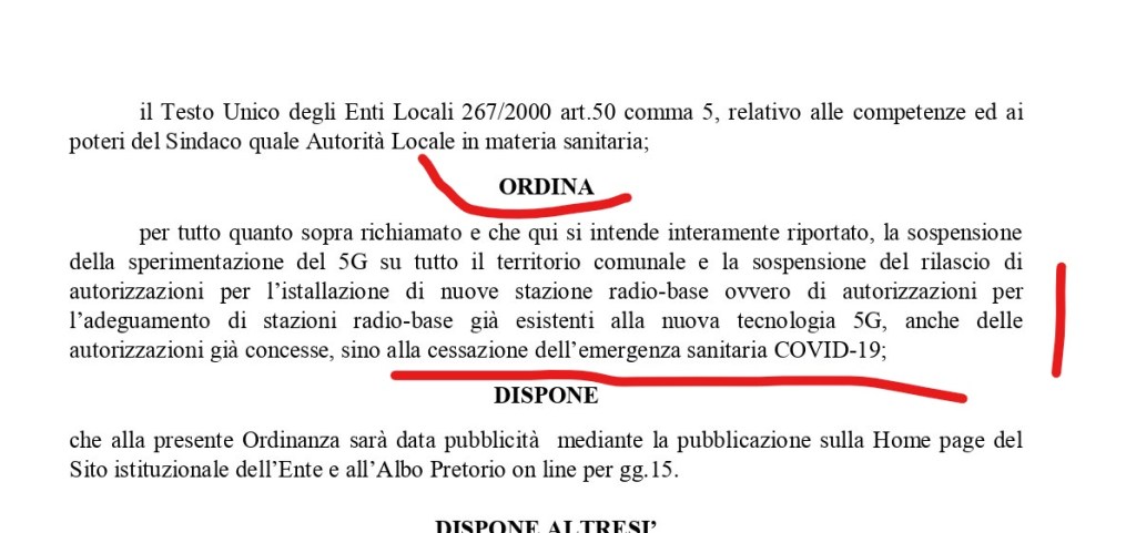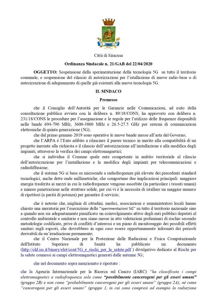Particolare la posizione del primo cittadino di Siracusa; capoluogo di provincia, oggi Libero Consorzio comunale di Siracusa, 120 mila abitanti, patrimonio mondiale UNESCO, il Sindaco del centro siciliano ha vietato il 5G fintanto che continuerà l’emergenza sanitaria del Covid 19. Come a dire, se la sanità pubblica è al collasso per il virus, meglio non aggravare la situazione con ulteriore elettrosmog.