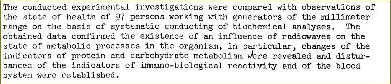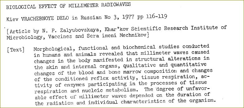 Pubblicato più di 40 anni fa e tenuto segreto fino ad otto anni fa, questo rapporto era segnato tra quelli “AD ESCLUSIVO USO DEL GOVERNO.” Gli scienziati russi esaminarono gran parte delle prime ricerche sugli effetti dell’esposizione alle radiazioni millimetriche. La US Central Intelligence Agency (CIA) ha raccolto e tradotto la ricerca. Nel 1977, Zalyubovskaya pubblicò uno studio dal titolo “Effetti biologici delle onde millimetriche“, in una rivista in lingua russa, “Vracheboyne Delo“. La CIA ha declassificato questo documento soltanto nel 2012. Lo studio indagò sui ratti gli effetti dell’esposizione alle radiazioni millimetriche (37-60 GHz; 1 milliwatt per centimetro quadrato) per 15 minuti al giorno per 60 giorni. I risultati sugli animali vennero confrontati con un campione di persone che lavoravano con generatori di onde millimetriche. Ecco un breve riassunto del documento non più top secret per l‘intelligence americana:
