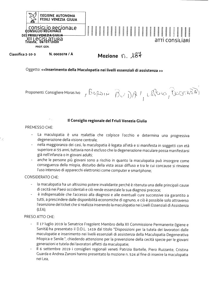 Approvata dal consiglio regionale del Veneto, adesso anche nel Consiglio della Regione Autonoma Friuli Venezia Giulia approda una mozione per chiedere al Governo di riconoscere la maculopatia con l’inserimento nei LEA (Livelli Essenziali di Assistenza). “La maculopatia è una malattia che colpisce l’occhio – si legge nella mozione presentata dal consigliere Ivo Moris – ha un altissimo potere invalidante, può insorgere come conseguenza della miopia, tra le cui concause si rilevano l‘uso intensivo di apparecchi elettronici come computer e Smartphone“. Una richiesta simile dovrebbe presto approdare anche nei consigli regionali di Lombardia, Emilia Romagna e Trentino Alto Adige.