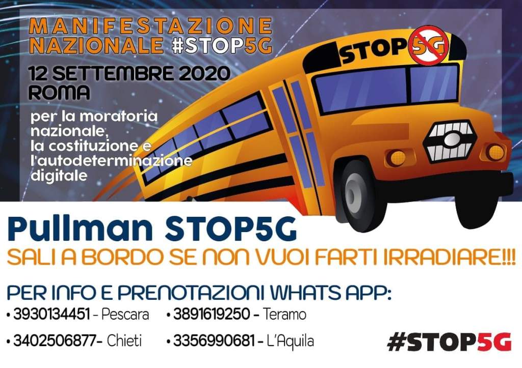 “PER LA MORATORIA, LA COSTITUZIONE, LE LIBERTA’ E L’AUTODETERMINAZIONE DIGITALE“, il titolo dell’evento Stop 5G previsto Sabato 12 Settembre 2020.