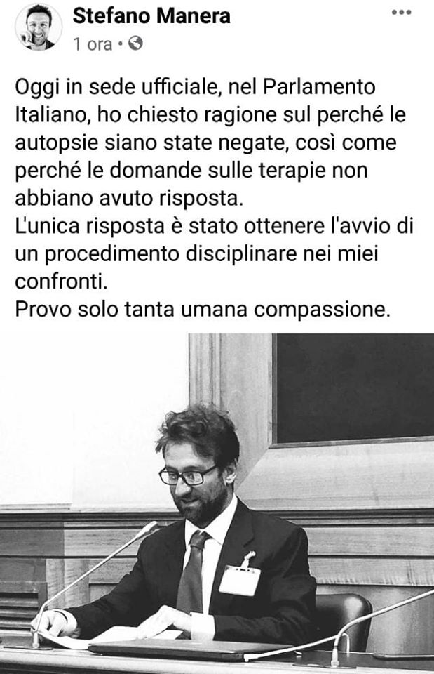 Manera, nel corso del suo intervento, ha chiesto conto della negata autorizzazione alle autopsie e delle mancate indicazioni sulle terapie. Questo gli è valso l’avvio di un procedimento che si mostra basato su un pregiudizio ideologico e sul maldestro tentativo dell’Ordine di assecondare la narrazione mediatica sulle criticità della gestione dell’emergenza Coronavirus.
