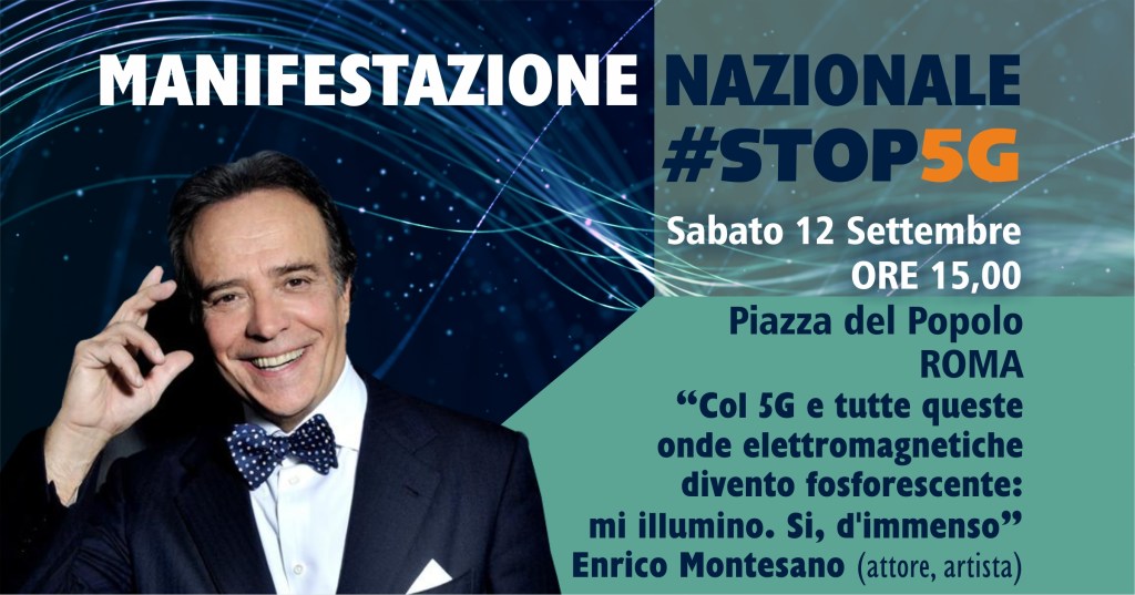 Mondo dello spettacolo mobilitato per sensibilizzare Governo e opinione pubblica sui gravi rischi del 5G: dopo la presa di posizione di Romina Power, Raz Degan e le adesioni del cantante Miguel Bosè e dell’attrice Lavinia Longhi, protagonista dello spot promozionale per la manifestazione nazionale Stop 5G dal titolo “Per la moratoria, la Costituzione, le libertà e l’autodeterminazione digitale” in programma a Roma, sarà sul palco di Piazza del Popolo anche l’attore e artista Enrico Montesano “Col 5G e tutte queste onde elettromagnetiche divento fosforescente: mi illumino. Si, d’immenso“, le parole di Montesano nei panni del ‘figlio di papà’ in uno sketch comico postato sui social.