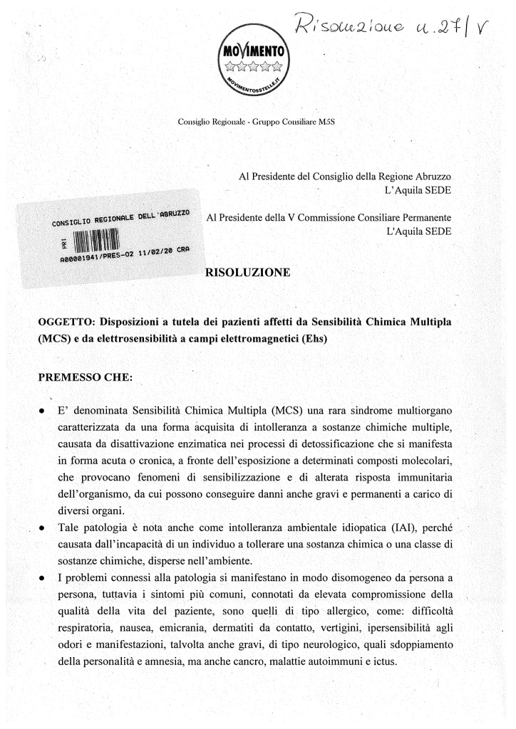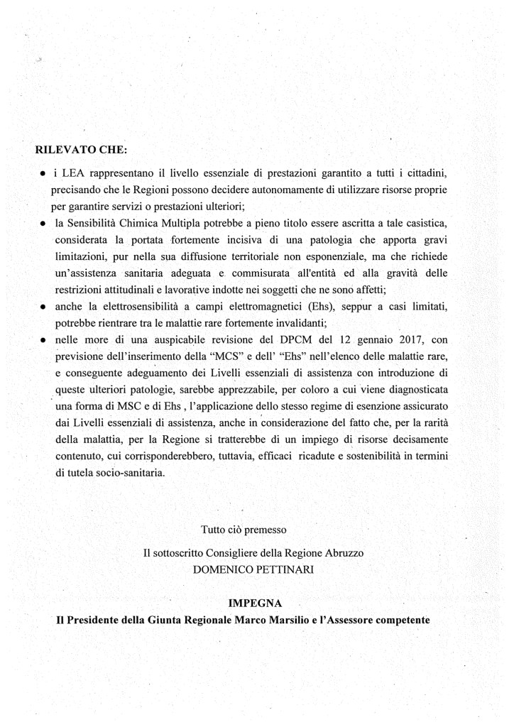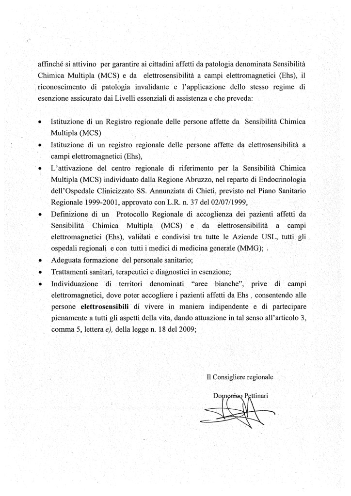 Con la Risoluzione n. 27 protocollata al Consiglio regionale dell’Abruzzo lo scorso 11 Febbraio, Pettinari vuol infatti impegnare il presidente Marco Marsilio, l’Assessore regionale con deleghe alla Salute e Pari opportunità Nicoletta Verì e Mario Quaglieri (a capo della Commissione Salute, Sicurezza sociale, Cultura, Formazione e Lavoro) a riconoscere le patologie dell’Era Elettromagnetica e degli inquinanti ambientali, pericolosissimi neuro interferenti endocrini: “disposizione a tutela dei pazienti“, si legge nella risoluzione non ancora calendarizzata.