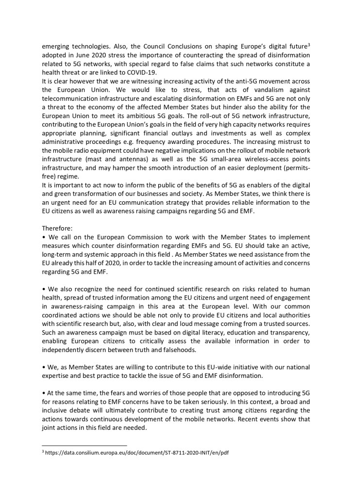 È importante agire ora per informare il pubblico dei vantaggi del 5G come abilitatori del sistema digitale e la trasformazione ecologica delle nostre imprese e della società. Come Stati membri, pensiamo che ci sia un’urgente necessità di una strategia di comunicazione dell’UE che fornisca informazioni affidabili ai cittadini dell’UE e le campagne di sensibilizzazione sul 5G e sui campi elettromagnetici. Pertanto:
