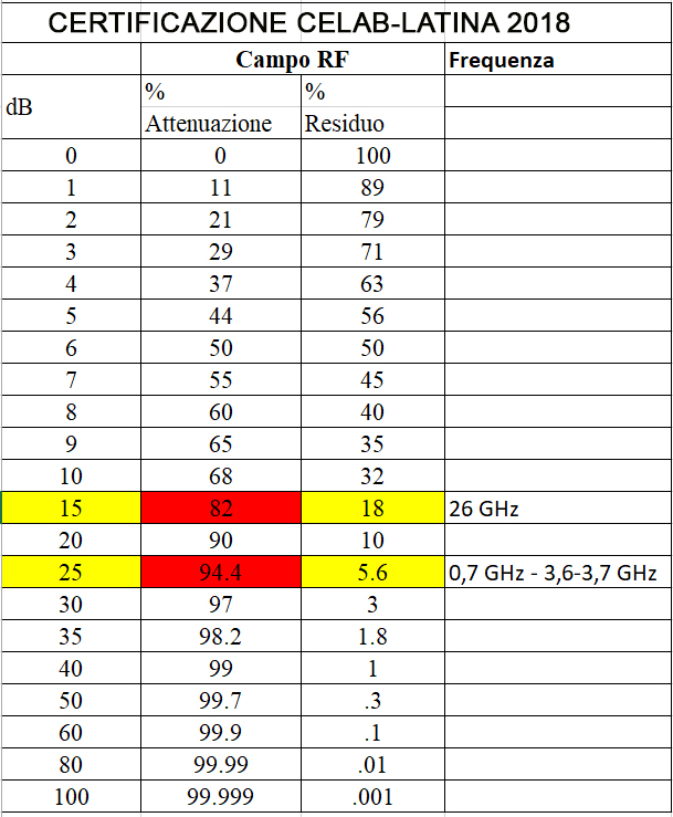 Scherma le frequenze dalle più basse, campo elettrico 50 Hz della rete elettrica, fino alle più alte del prossimo 5G a 26 GHz. E’ certificato dalla CELAB di Latina.