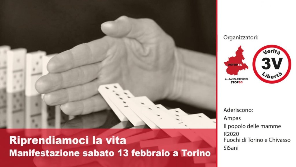 Alleanza Piemonte Stop 5G torna in piazza. E lo fa ancora una volta a Torino insieme al Movimento 3V con la partecipazione di altre sigle (R2020 fuochi di Torino e Chivasso, il Popolo delle Mamme, Ampas e Sisani sindacato Medici Ippocratici), nella manifestazione indetta per Sabato 13 Febbraio 2021 in Piazza Castello (inizio ore 14.30). Ecco la nota diffusa dagli organizzatori.