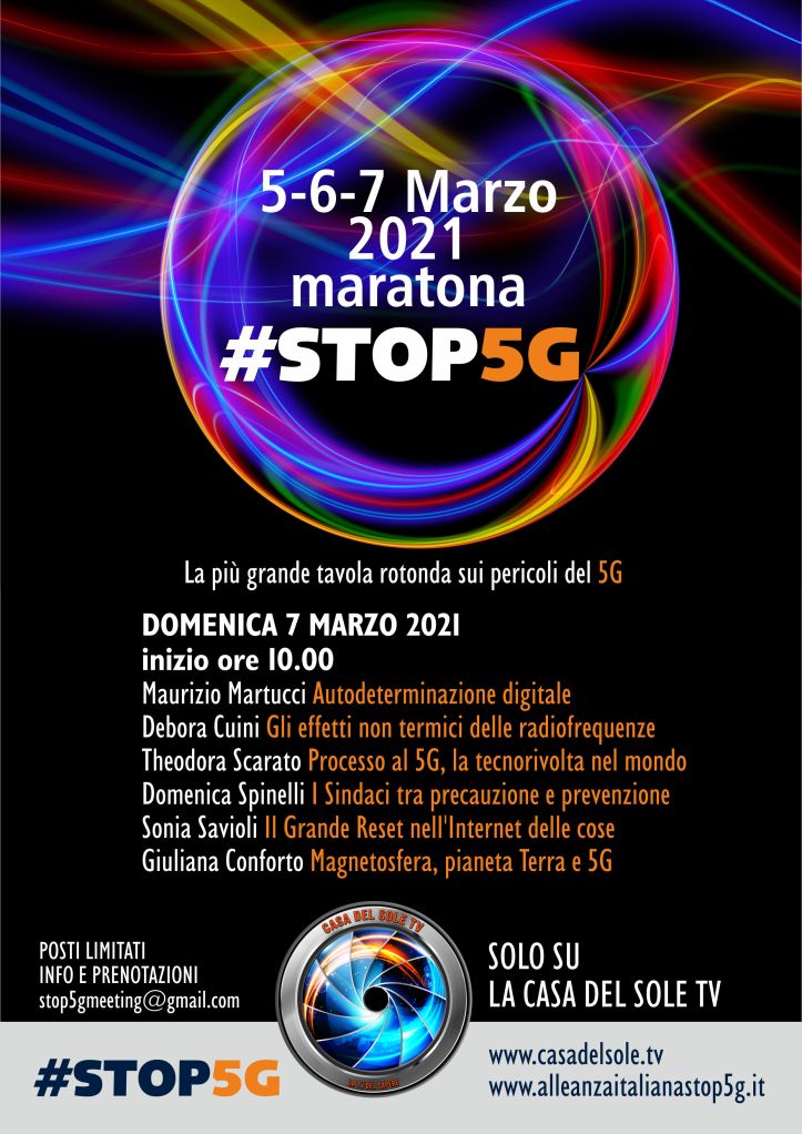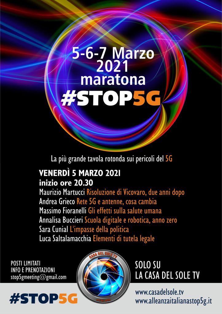 L’evento sarà on-line e riservato ai soli iscritti. Ogni partecipante potrà seguirlo solo dietro prenotazione. Tutte le informazioni e le modalità di adesione verranno fornite scrivendo una email all’indirizzo stop5gmeeting@gmail.com