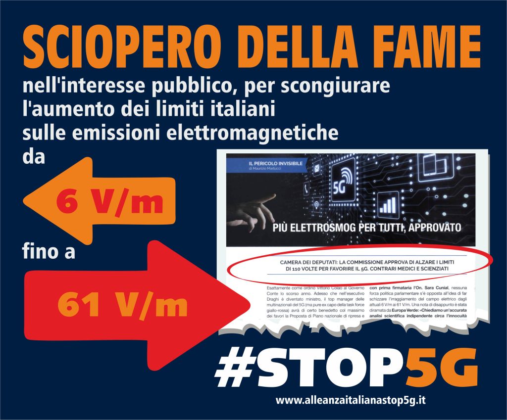 Infine, la richiesta di non innalzare i limiti italiani sulle emissioni elettromagnetiche è per altro già contenuta nella petizione Stop 5G lanciata nel 2019 da Alleanza Italiana Stop 5G e già sottoscritta da oltre 62.000 cittadini, nella richiesta al Governo dimantenere gli attuali valori limite di legge nella soglia d’irradiazione elettromagnetica, puntando sulla minimizzazione del rischio proprio come indicato nei Report del Bioinitiative Group, dal Parlamento Europeo nella Risoluzione del 2009 e l’Assemblea del Consiglio d’Europa con la Risoluzione n° 1815 del 2011, volta ad un abbassamento dei limiti di legge a 0,6 V/m nell’immediato e a 0,2 V/m sul lungo termine, valutando tutte le opinioni critiche e i giudizi negativi giunti dalla comunità scientifica in merito agli effetti di un eventuale innalzamento dei limiti di legge, abrogando altresì l’articolo 14 del Decreto Sviluppo “Ulteriori misure urgenti per la crescita del Paese” (DL n° 179 del 18/10/2012 pubblicato sulla G.U. n° del 19/10/2012), che impone una misurazione dei campi elettromagnetici su una media di 24 ore (valore arbitrario), anziché sui 6 minuti (valore basato su motivazioni biologiche)”.