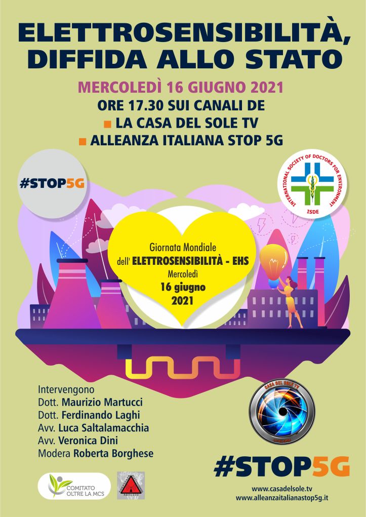 ”Elettrosensibilità, diffida allo Stato”: mercoledì 16 Giugno ore 17.30 diretta web con ISDE e Alleanza Italiana Stop 5G