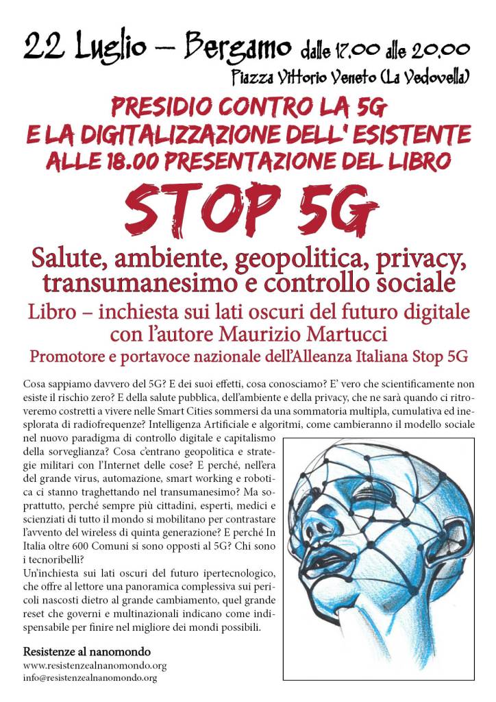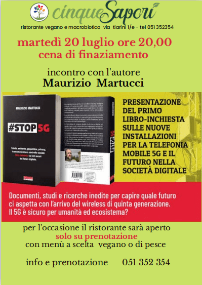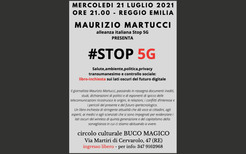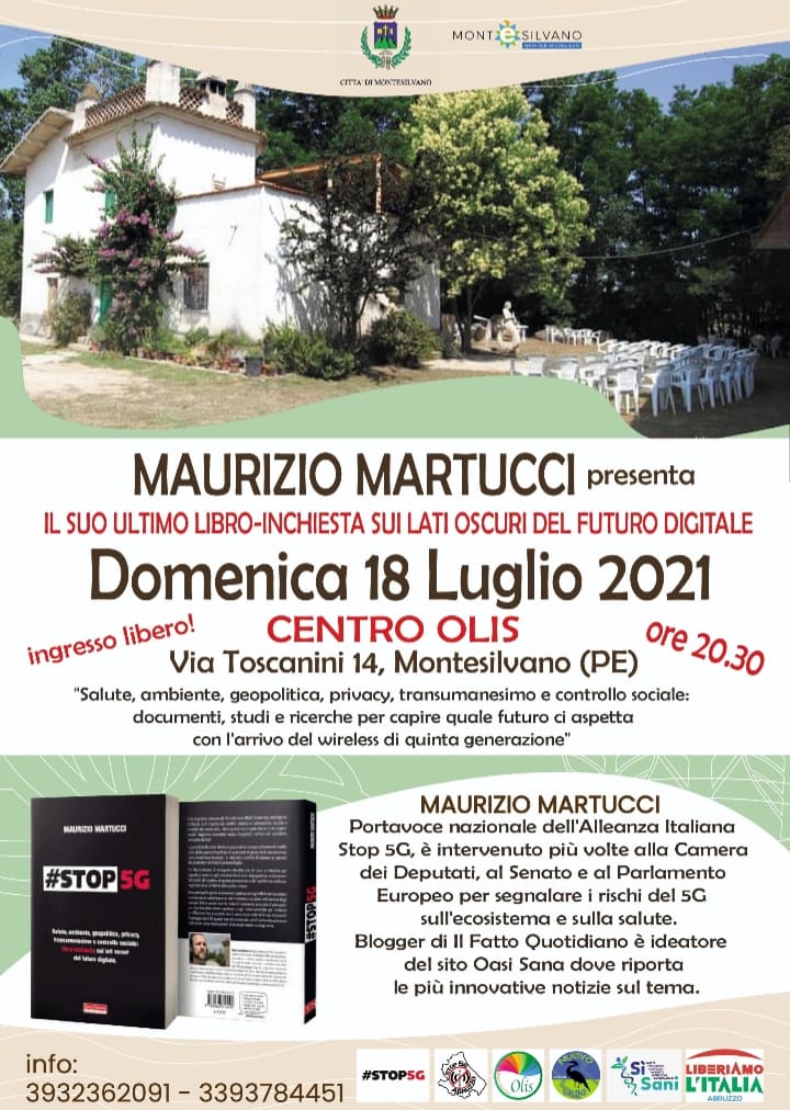 Nove giorni, otto tra città e comuni dell’hinterland, sei capoluoghi di provincia, nove presentazioni, una dietro l’altra: inizia il tour del giornalista e scrittore Maurizio Martucci, ideatore di Oasi Sana, promotore e portavoce nazionale dell’Alleanza Italiana Stop 5G, in giro per l’Italia del centro nord a presentare la sua ultima fatica, dal titolo “#STOP5G, salute, ambiente, geopolitica, privacy, transumanesimo e controllo sociale: libro-inchiesta sui lati oscuri del futuro digitale“, (Terra Nuova Edizioni, 281 pagine, 18,00 €). “Non lo ha fatto la Rai come servizio pubblico, ci penserà un libro: sarà l’occasione per informare i cittadini di quanto i nostri governanti hanno deciso per il futuro degli italiani, senza il nostro consenso, ma con l’avallo delle multinazionali delle telecomunicazioni che – principalmente – puntano ad un cambio antropologico della società civile e persino dell’ambiente e della specie umana, immergendoci di radiofrequenze possibili agenti cancerogeni ed anti-naturali“.