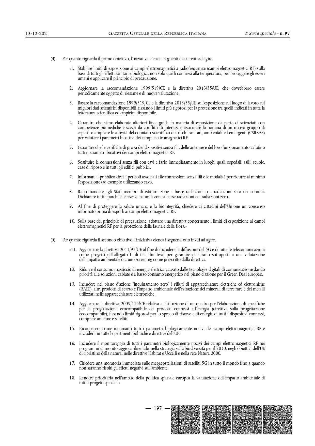 Nella 2a Serie Speciale – Unione Europea n. 97 del 13 Dicembre 2021, nella Gazzetta Ufficiale della Repubblica italiana è stata pubblicata la decisione di esecuzione della Commissione europea per la registrazione dell’iniziativa dei popolare dei cittadini europei (ECI) dal titolo ‘Stop 5G’ in cui si afferma come “l’implementazione del 5G sta mettendo in gioco i nostri diritti a un ambiente sano, alla libertà e alla privacy. Chiediamo alla Commissione di proporre una legislazione per proteggere i cittadini e l’ambiente da queste minacce“.