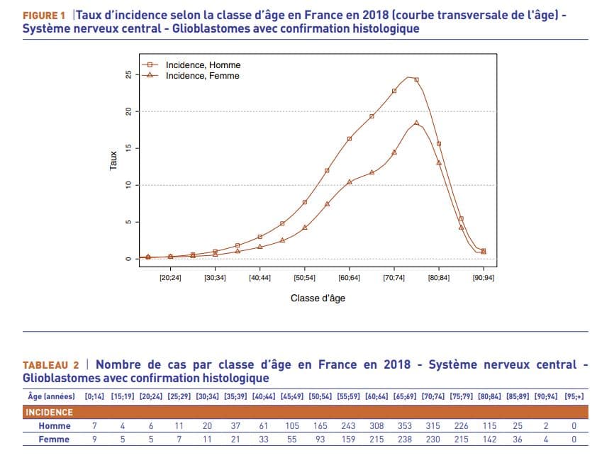 Inoltre, se questi dati di base dello studio vengono confrontati con alcuni degli ultimi dati disponibili da Public Health France sui glioblastomi (cancro al cervello grave), possiamo vedere per analogia che, in questa fase dello sviluppo umano, il numero di casi è abbastanza simili per i tre gruppi di età (tabella sotto).