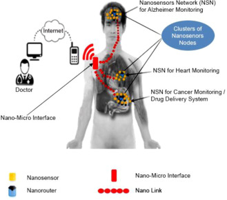 I dispositivi su scala nanometrica richiedono un nuovo paradigma di comunicazione; svolgono compiti semplici, condividono i dati raccolti e raggiungono un numero senza precedenti di posizioni su Internet. Questo nuovo paradigma di rete è chiamato IoNT [ 1]. Nell’IoNT, la nuova architettura di rete è stata proposta per ospitare due potenziali applicazioni: interconnessione di dispositivi su scala nanometrica e uffici di interconnessione. Il nostro lavoro di ricerca si concentra sulle comunicazioni intracorporee per gli operatori sanitari per sviluppare l’architettura del sistema di rete per la realizzazione di applicazioni IoNT. Il corpo umano è composto da quasi 80 organi. Qui, i nanosensori possono essere impiantati negli organi, rilevando sintomi o virus specifici e inoltrando i dati di rilevamento al nanorouter. Il nanorouter può raccogliere dati dai nanosensori. Il nanorouter può quindi inviare i dati raccolti all’esterno del corpo.