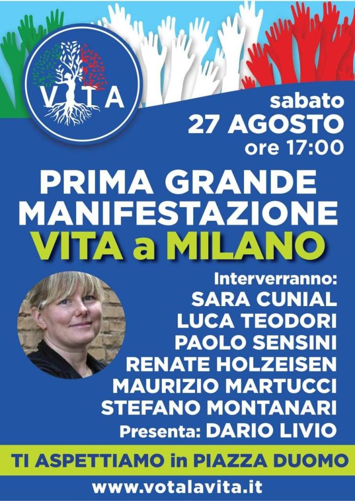 Parte da Milano la campagna elettorale della lista unitaria VITA: sabato 27 Agosto 2022 si terrà infatti la prima grande manifestazione nazionale del partito presieduto da Sara Cunial. L’appuntamento è alle ore 17 nella centralissima Piazza Duomo.