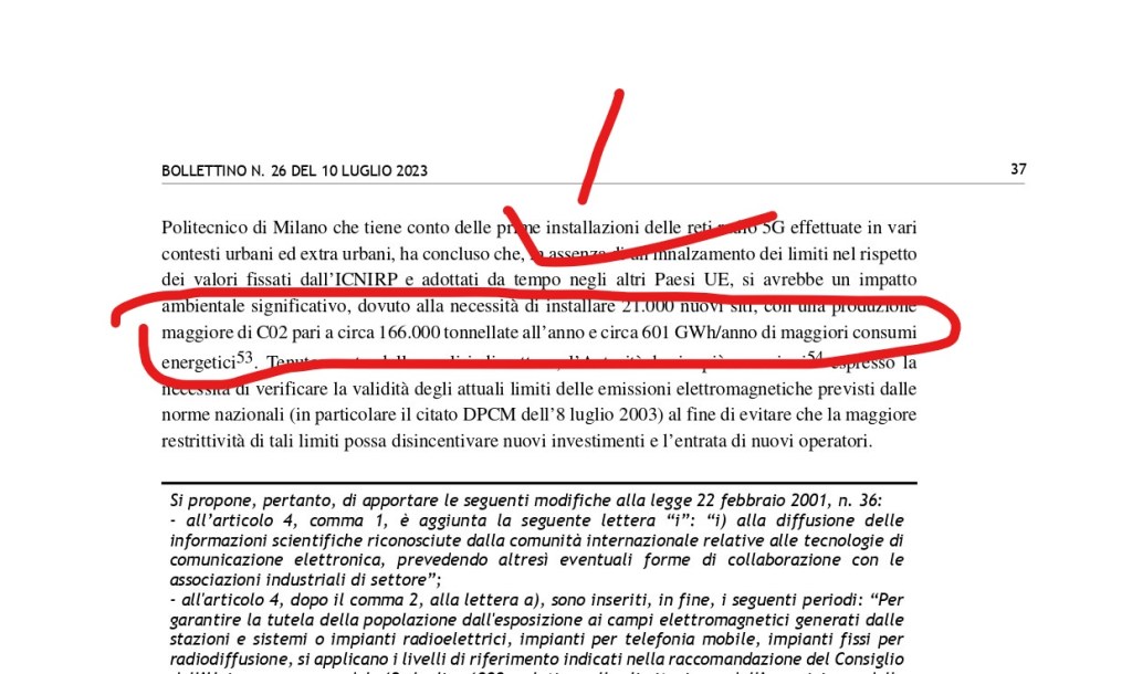 Altro passaggio controverso contenuto nella relazione dell’AGCM è il paradosso nel parere e richiesta girata al Governo Meloni di innalzare l’elettrosmog in tutta Italia per favorire la concorrenza commerciale del 5G. Citando un’audizione in Parlamento di ASSTEL (il ramo di Confindiustria delle Telecomunicazioni) e un rapporto fornito dal Politecnico di Milano, AGCM certifica come per la quinta generazione già ai livelli attuali dei limiti di esposizione dal wireless “si avrebbe un impatto ambientale significativo (…) con una produzione maggiore di C02 pari a circa 166.000 tonnellate all’anno e circa 601 GWh/anno di maggiori consumi energetici“, rifugiandosi nel falso mito di una proporzione inversa secondo cui aumentare l’elettrosmog abbasserebbe sia l’emissione di CO2 che i consumi energetici, temi a cuore all’Agenda 2030 dell’ONU sottoscritta dall’Italia. Nulla di più falso, ecco perché: