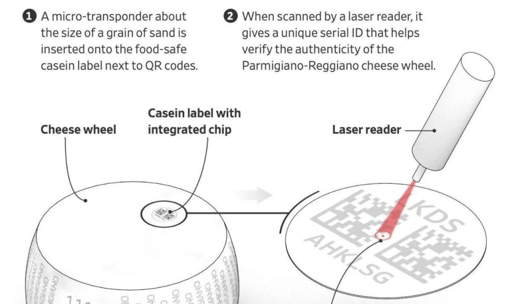 “I produttori di parmigiano reggiano in Italia combattono la contraffazione inserendo microchip commestibili nei loro prodotti ”