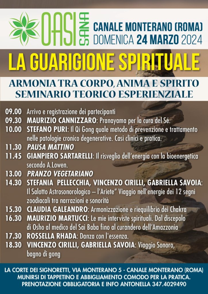 OASI SANA promuove un altro evento olistico: con l’arrivo della primavera un seminario teorico esperienziale è in programma alle porte di Roma in una struttura interamente riservata all’occasione. La guarigione spirituale: armonia tra corpo, anima e spirito è il titolo dell’evento in programma Domenica 24 Marzo 2024 dal mattino fino al tramonto, tutto in un solo giorno comprensivo di seminari, conferenze, pratiche, Qi-Gong, Yoga e bagni di gong con relatori qualificati ed operatori esperti.