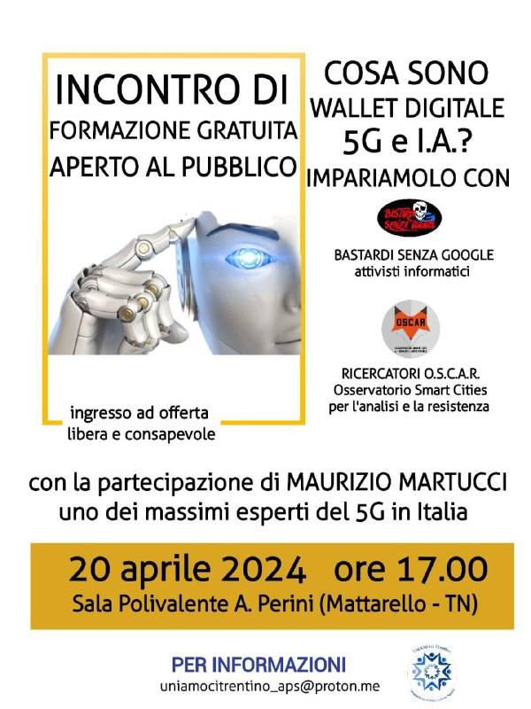 Intanto proprio il prossimo sabato 20 Aprile 2024, il giornalista d’inchiesta Maurizio Martucci sarà a Mattarello (Trento) per una conferenza in tema 5G, transizione digitale, elettrosmog, Intelligenza artificiale, smart city.