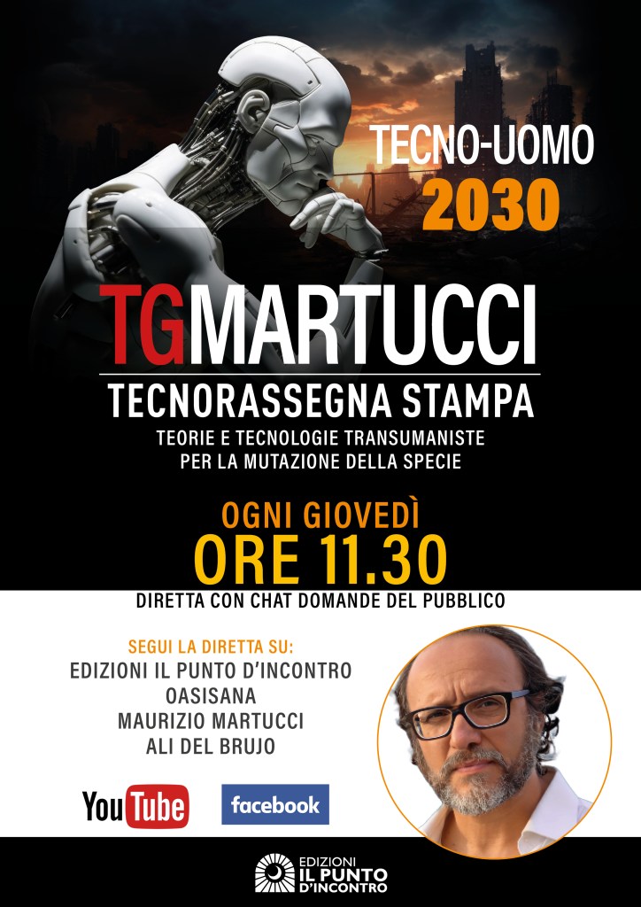 In diretta il giornalista d’inchiesta Maurizio Martucci legge e commenta le più rilevanti notizie della settimana sui temi della Quarta Rivoluzione Industriale. Per le Edizioni Il Punto d’Incontro sta per uscire il nuovo libro di Maurizio Martucci dal titolo “Tecno-Uomo 2030. Teorie e tecnologie transumaniste per la mutazione della specie“, nel quale l’autore scoperchia il vaso di Pandora sui reali obiettivi transumanisti nascosti dietro l’etichetta della transizione digitale, obiettivi dettati nell’agenda neoglobalista partorita da centri occulti di potere e organismi sovranazionali che, supportati da agenzie militari, ambiscono alla creazione del Tecno-Uomo per la post-umanità e la società dei gigabit.