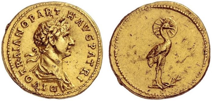 Con Adriano, con i due superbi aurei del 118 e del 121 volti a glorificare, il primo, la memoria di Traiano asceso al cielo e, il secondo, il ristabilimento del regno di Saturno con la sicurezza e il benessere assicurati dall’opera di pacificazione svolta dal nuovo Imperatore che aveva garantito la sicurezza dei confini, ponendo fine a campagne espansionistiche. L’uccello risorto dalle fiamme diviene nunzio del ritorno dell’età dell’oro, il Saeculum Aureum, in una concezione del tempo ciclica risalente, nella tradizione greco-romana, a Esiodo, ma propria anche dell’India vedica e di altre civiltà. La moneta, poi, non era mera merce di scambio ma il mezzo attraverso cui il Princeps, nella sua veste di Pontefice Massimo, esercitava in virtù del simbolo effigiato un’effettiva influenza spirituale, fecondante, magica, in tutta l’ecumene imperiale, facendo appello alle capacità più elevate di comprensione per ribadire i valori del Mos Maiorum.