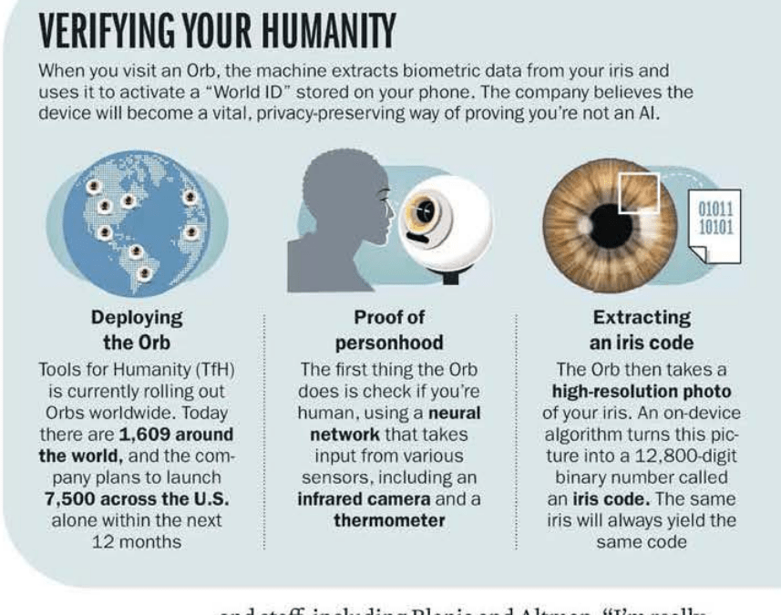 Dalla casella da cliccare ‘Non sono un robot‘ accanto alle foto di un puzzle ingannevole fino ad “essere umano verificato” con riconoscimento biometrico-facciale. Entro la fine del 2025, il passo è breve. “Avevamo bisogno di un modo per identificare e autenticare gli esseri umani”. Nei prossimi mesi, così dovrebbe cambiare l’accesso ad Internet nell’Era dell’Intelligenza artificiale, tra foto ad alta risoluzione e rete neurale con telecamera a infrarossi e termometro. Da un palco di San Francisco (California, USA) lo ha annunciato Sam Altman, padre di OpernAI e nume tutelare di Stargate, la super Intelligenza artificiale da 500 miliardi di dollari commissionata dal presidente Donald Trump. “È una sfera bianca grande quanto un pallone da spiaggia, con una telecamera al centro” – si legge sull’ultimo numero della prestigiosa rivista americana Time che, in esclusiva, titolando “Sei Umano?” descrive il sistema di prossimo accesso al Web – “l’azienda che la produce, nota come Tools for Humanity, chiama questo misterioso dispositivo Orb. Fissa il cuore del globo di plastica e silicio e mapperà i solchi e le zone ciliari dell’iride oculare. Pochi secondi dopo, riceverai la prova inviolabile della tua umanità: un numero binario di 12.800 cifre, noto come codice dell’iride, inviato a un’App sul tuo telefono. Contemporaneamente, un pacchetto di criptovaluta chiamato Worldcoin, del valore di circa 42 dollari, verrà trasferito sul tuo portafoglio digitale: la tua ricompensa per essere diventato un “essere umano verificato“.
