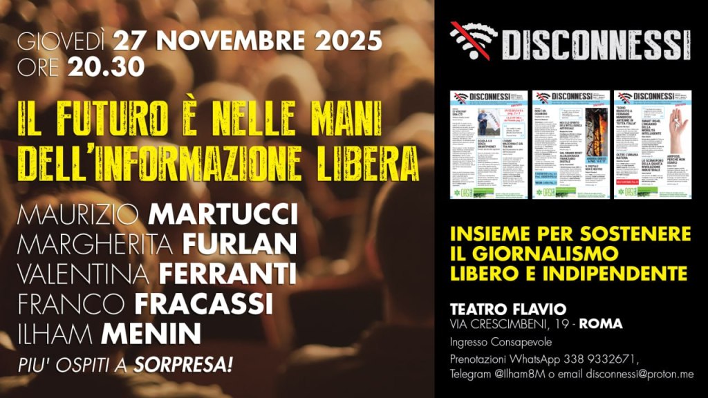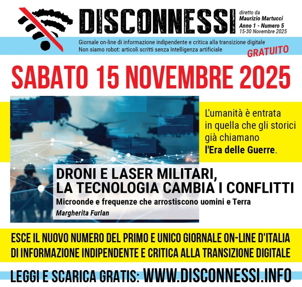 Sabato 15 Novembre 2025 è uscito il nuovo numero di Disconnessi, il primo e unico giornale libero d’Italia d’informazione indipendente e critica alla transizione digitale. Un numero ricco, ben 30 pagine con inchieste, interviste, approfondimenti e notizie di prima mano. I focus principali sono su filosofia e pensiero, smart meter, guerra e robot.