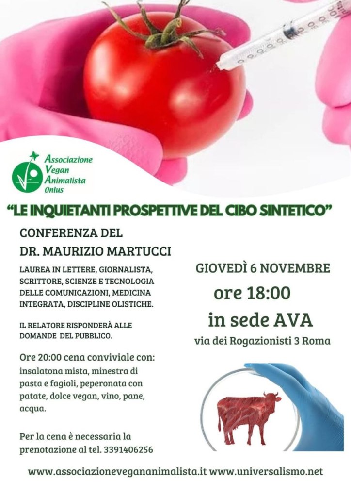 “Siamo nel pieno della rivoluzione alimentare, ben oltre gli OGM c’è il cibo sintetico, la carne stampata in 3D, il formaggio e la frutta con il microchip: è l’unione delle nuove tecnologie con la filiera del food, l’Agenda 2030 non vuole solo stravolgere gli stili di vita dei cittadini nelle Smart City e gli spostamenti su gomma con la Smart Road, ma anche l’alimentazione con cibo monitorato, controllato e ad impronta carobonica zero“: sono alcuni passaggi della conferenza del giornalista Maurizio Martucci tenuta a Roma nella sede dell’Associazione Vegan Animalista ONLUS (AVA) presieduta da Franco Libero Manco.