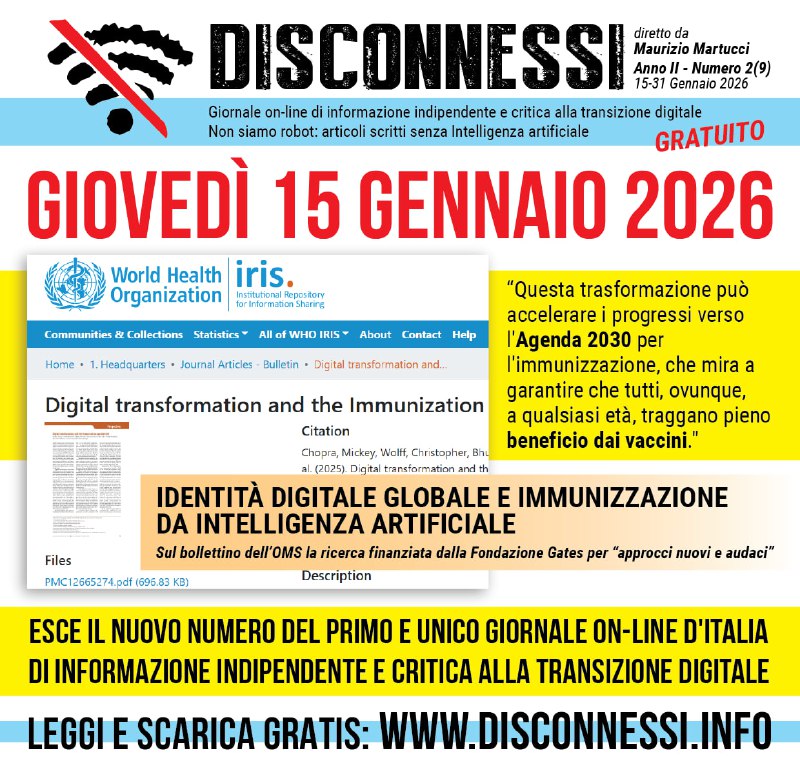 Giovedì 15 Gennaio 2026 è uscito il nuovo e nono numero di Disconnessi, il primo e unico giornale libero d’Italia d’informazione indipendente e critica alla transizione digitale fondato e diretto dal giornalista Maurizio Martucci. Ancora una volta pagine tutte da leggere con inchieste e notizie sui lati oscuri della digitalizzazione nell’avanzamento tecnologico.