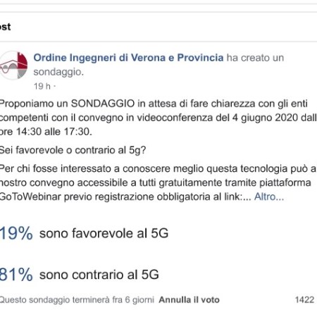 Verona, sondaggio dell’Ordine ingegneri sul 5G. Un plebiscito: 81% dei cittadini è contrario!