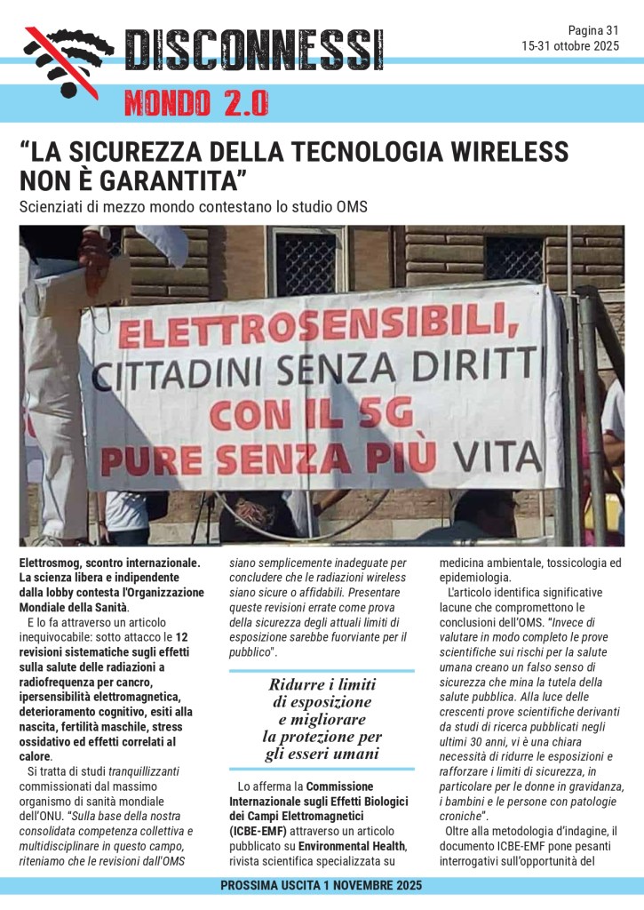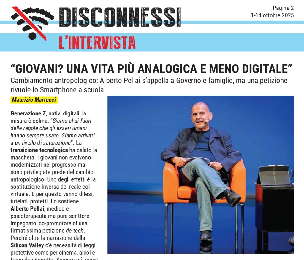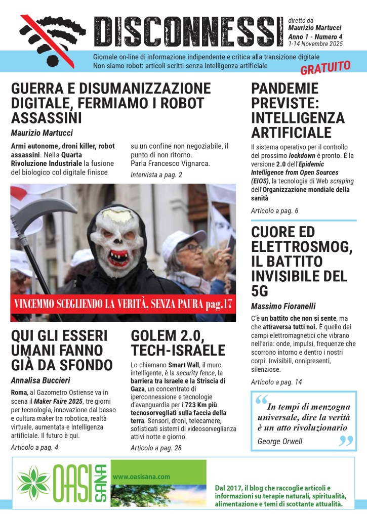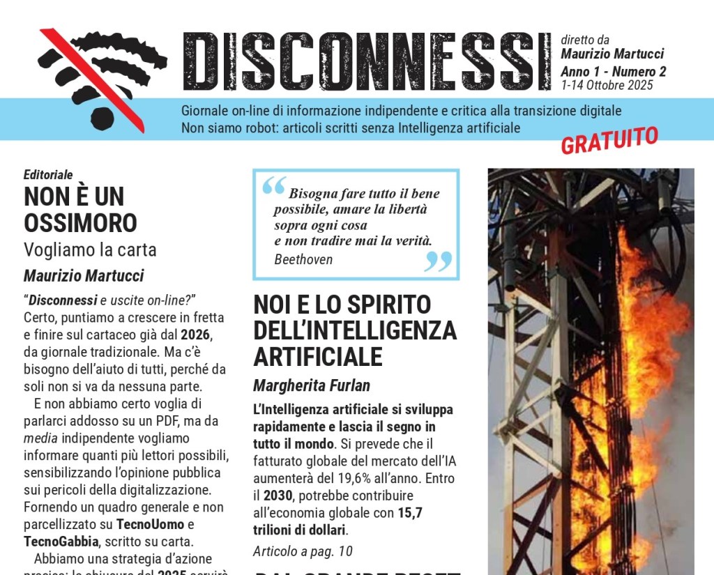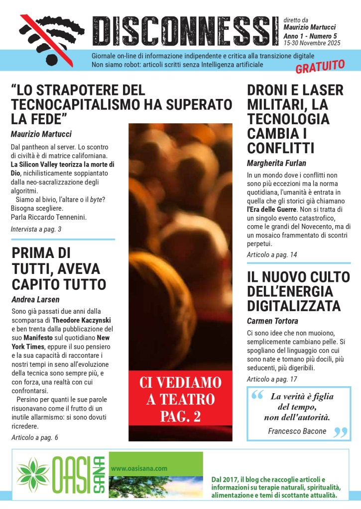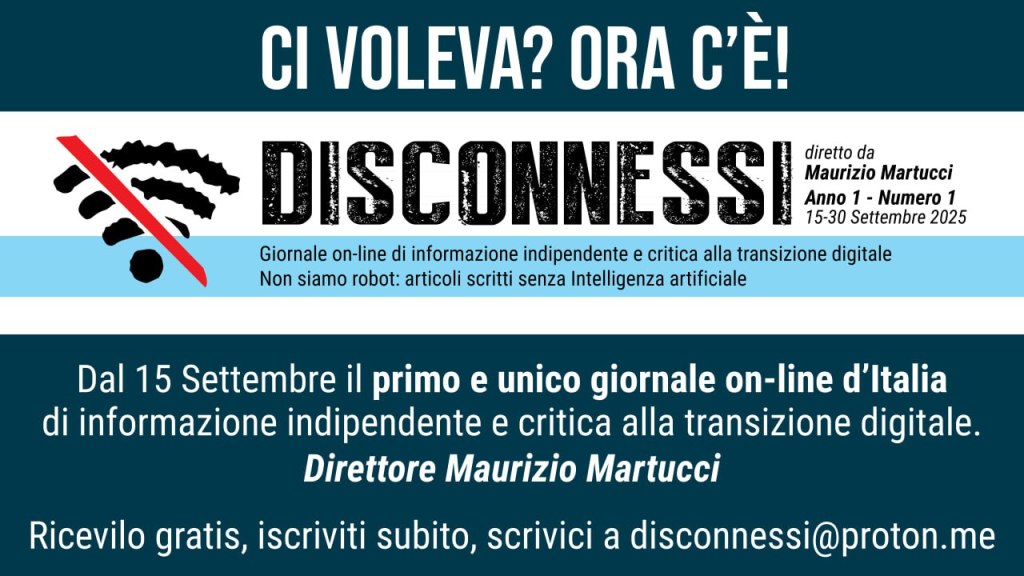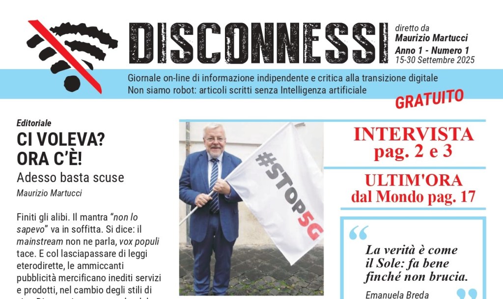 Notizie vere e fatti riscontrati, interviste, analisi e commenti, scrivere senza peli sulla lingua quello che gli altri non dicono in tema di digitalizzazione: per colmare un’incomprensibile vuoto editoriale, dall’idea di Maurizio Martucci il 15 Settembre 2025 nasce il primo numero di Disconnessi, giornale on-line indipendente di informazione e critica alla transizione digitale. La prepotente avanzata di un nuovo modello di società civile per una nuova umanità legata inesorabilmente agli algoritmi ha portato alla nascita di Disconnessi, testata che si prefigge l’obiettivo di informare l’opinione pubblica sui pericoli e la deriva tecnologica che sta investendo l’Italia e gli italiani. OASI SANA è media partner di Disconnessi.