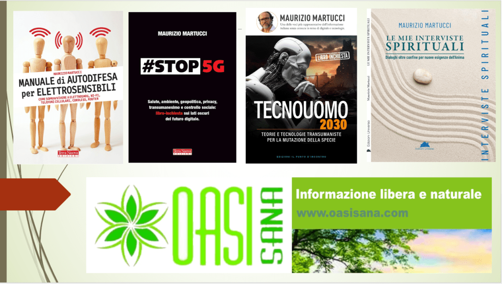 Libri di Maurizio Martucci Tecno-Uomo 2030. Teorie e tecnologie transumaniste per la mutazione della specie (Edizioni Il Punto d’Incontro) – CLICCA QUI #STOP5G, salute, ambiente, geopolitica, privacy, transumanesimo e controllo sociale: libro-inchiesta sui lati oscuri del futuro digitale (Terra Nuova Edizioni) – CLICCA QUI Manuale di autodifesa per Elettrosensibili, come sopravvivere all’Elettrosmog (Terra Nuova Edizioni) – CLICCA QUI Le mie interviste Spirituali. Dialoghi oltre confine per nuove esigenze dell’Anima (Edizioni Universo) – CLICCA QUI ACQUISTALI SU OASI SANA CON SCONTO E DEDICA PERSONALIZZATA DELL’AUTORE Condividi: Fai clic per condividere su X (Si apre in una nuova finestra) X Fai clic per condividere su Facebook (Si apre in una nuova finestra) Facebook Mi piace Caricamento...